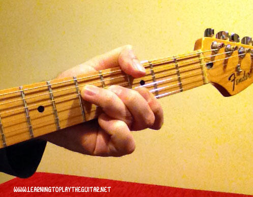 In this song he also makes extensive use of double (and triple) stop hammer-ons within the chords. In the intro you can hear these when he plays the higher versions of the Eb, E, F chords and sometimes in the fills he plays at the end of this riff which is based around the F chord.