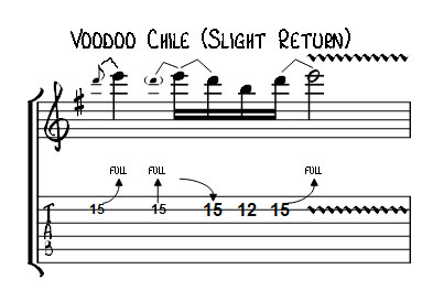 This song features an intro using sliding sus2 chords where Hendrix plays the chord then slides the chord shape to the next position along the neck. Guitarists such as Steve Vai have adopted this technique into their own style of playing. The slide makes the chords much more expressive then simply strumming each chord individually. Also note the use of the thumb again playing the bass notes on the 6th string.