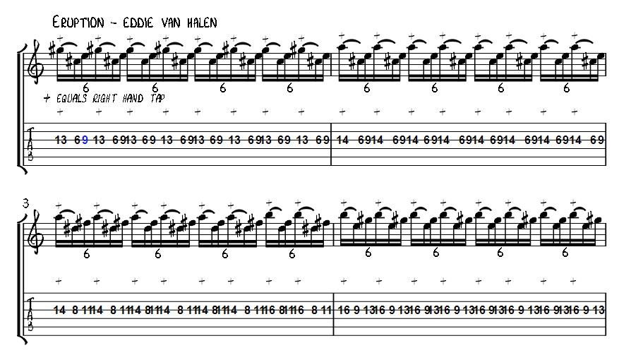 Eddie Van Halen is the player most associated with 2 hand tapping making a prominent technique in many Van Halen songs and a feature of the instrumental workout Eruption from the first Van Halen album. 2 hand tapping uses the fretting and picking hands to hammer on and pull off notes on the fret board with the picking hand fingers tapping out the higher pitched notes.