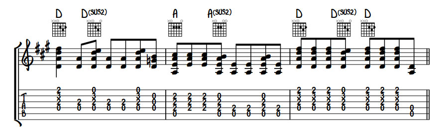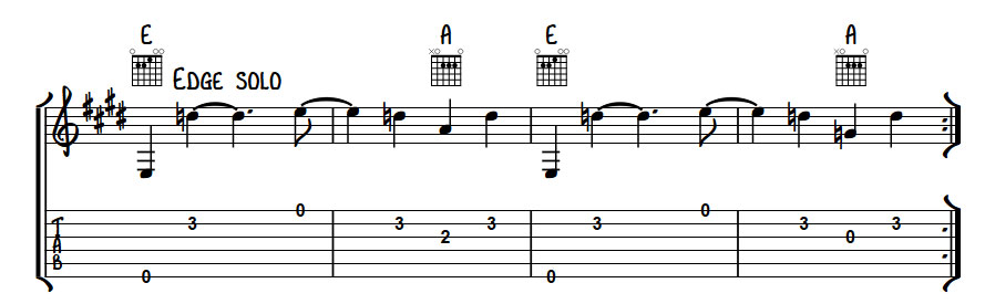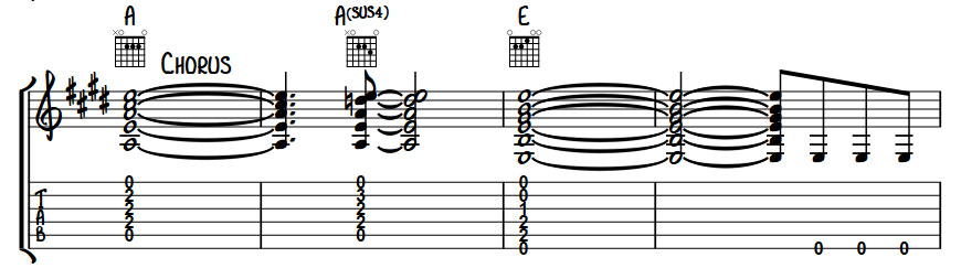 Edge also came up with a simple but effective hook at the end of the chorus alternating between sus chords and standard chords to create a melody.