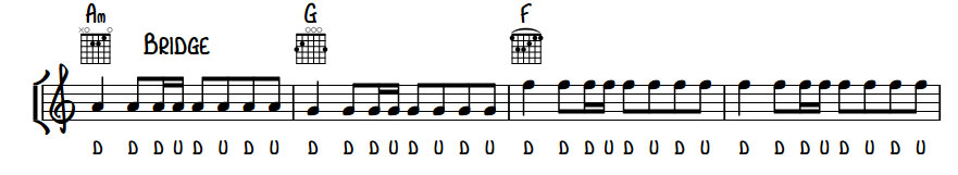 In the bridge it does add an Am chord while maintaining the same simple strumming. This is a great example of a simple song carried by a great melody.