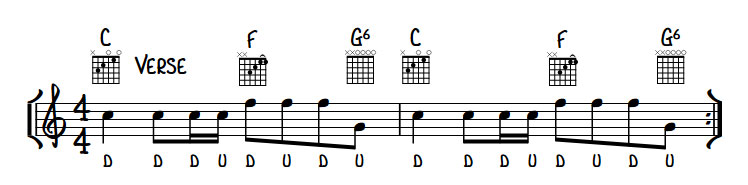 Recorded at legendary Sun Studios this simple 1 4 5 song in the key of C uses C F and G chords. The verse simply alternates between C and F. The strumming pattern throughout is fairly simple.