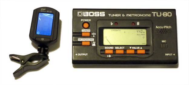 An electronic guitar tuner will help you to easily tune the strings of the guitar to the correct notes. The tuner will show a needle that will be placed in the middle when the string is in tune. Some tuners have a microphone to pick up the sound of the note while other clip-on guitar tuners attach to the guitar headstock and pick up the vibration of the string when it’s plucked.