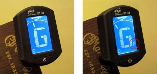 When using the electronic tuner pluck the open string and let it ring out for as long as possible for the tuner to work out what the note is. Once you can see the needle being displayed on the tuner tighten or loosen the string as required until the needle is in the middle of the display. Also make sure that you’re tuning to the correct note for the string as it’s easy to tune a G string to G# (one note up from G) if you’re not reading the display on the tuner correctly.