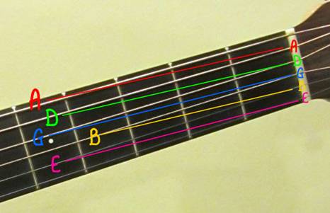 You can also tune the guitar using just your ear or aurally. This is done by tuning one string to another. The 5th fret note on the 6th (low thick E string) is A which is the same pitch as the open 5th string. Use the diagram below to see where these notes are on the strings to tune them with each other.
